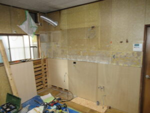 既存のキッチンを解体・撤去し、壁のタイルも一緒に処分。下地を補修後、新しいシステムキッチンを設置し、壁面も清潔感のあるキッチンパネルで仕上げます。
