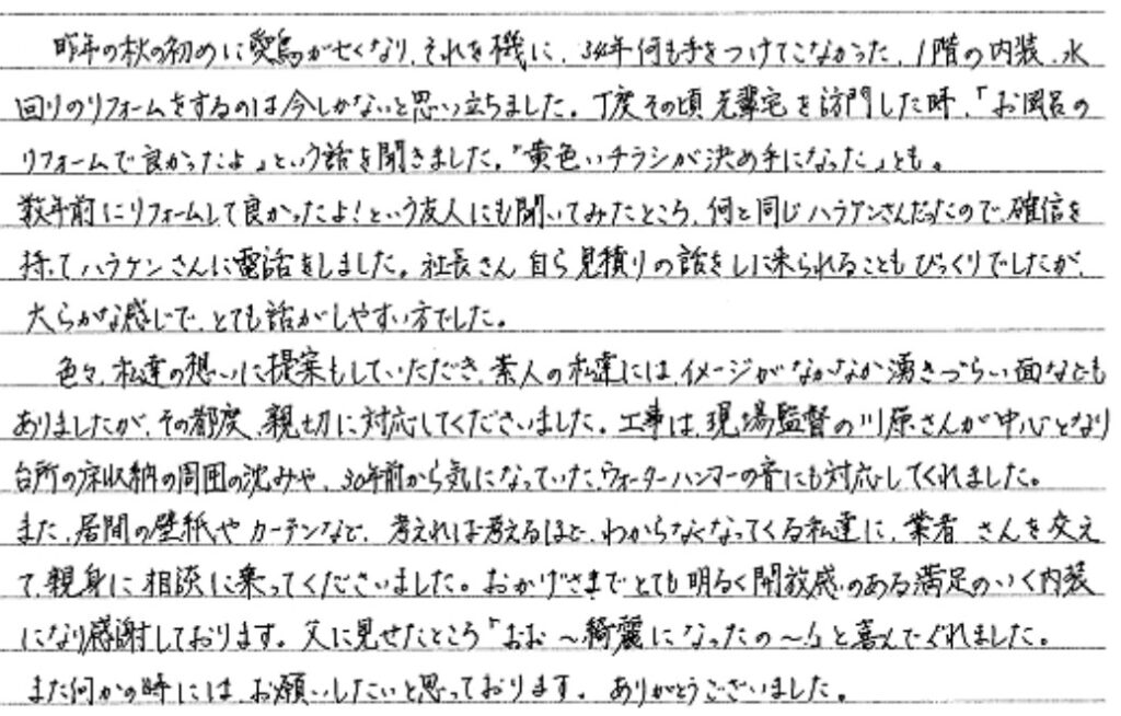 色々私達の想いに提案していただき、素人の私達にはイメージがなかなか湧きづらい面などもありましたが、その都度親切に対応してくださいました。工事は現場監督の川原さんが中心となり台所の床収納の周囲の沈みや、30年前から気になっていたウォーターハンマーの音にも対応してくれました。また、居間の壁紙やカーテンなど、考えれば考えるほどわからなってくなる私達に、業者さんを交えて親身に相談に乗ってくださいました。