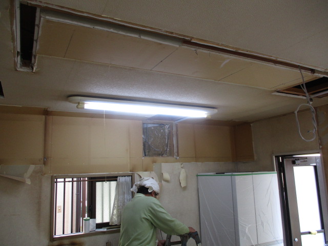 天井補修 仕切り壁撤去後の天井を下地材で補強します。天井に、LEDダウンライト照明を設置する配線の工事をします。