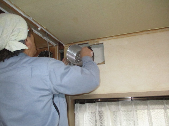 換気扇開口・壁下地補修 外部換気扇フードを新設→換気扇ダクト設置→壁にプラスターボードを設置し、補強しました。