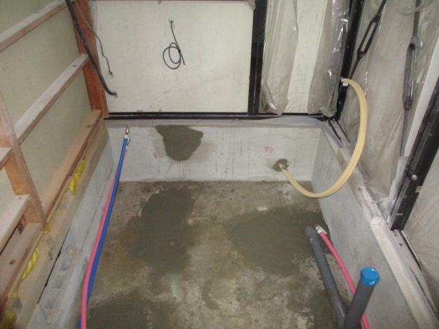 設備工事 給排水配管の接続(給水管(青)、給湯管(ピンク)、追炊き用ホース(白))→電気配線の工事をしました。