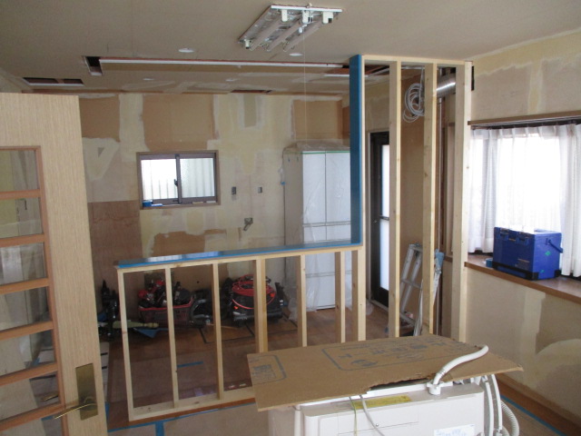 対面キッチン造作 設置するキッチンの位置を決め、壁を造るために、木材(間柱)を組みます。