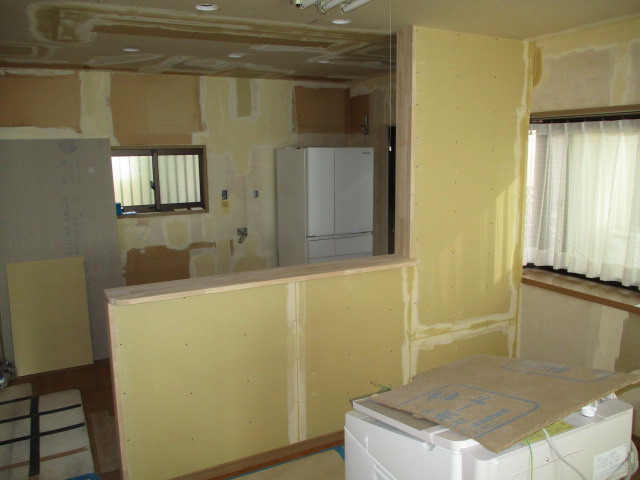 仕切り壁設置 プラスターボードで壁を造り、新しくカウンターも造りました。吊戸棚は、設置せず、開放感のあるキッチンを造ります。