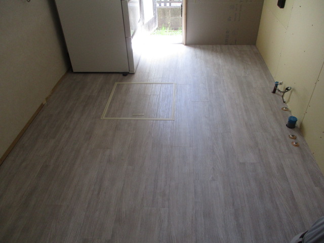 既存洗面化粧台を撤去処分し、床を下地材で補修→CFを貼りました。新しく洗面台を設置します。
