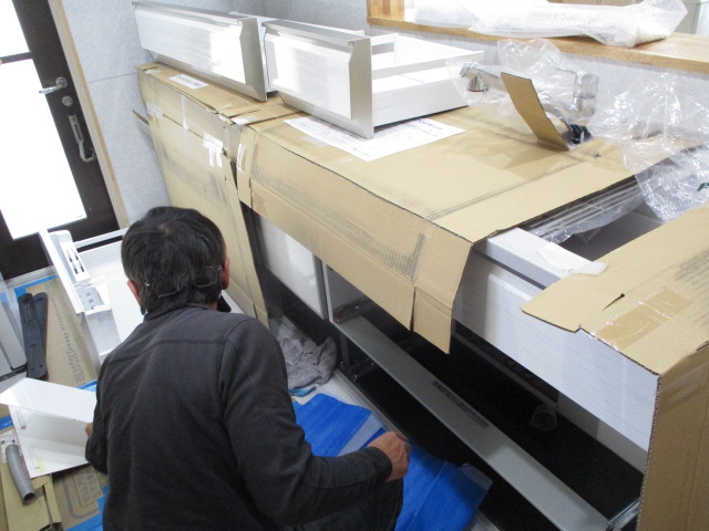 システムキッチン搬入・組み立て キッチンパネルを貼り、キッチンの土台を組み立てます。