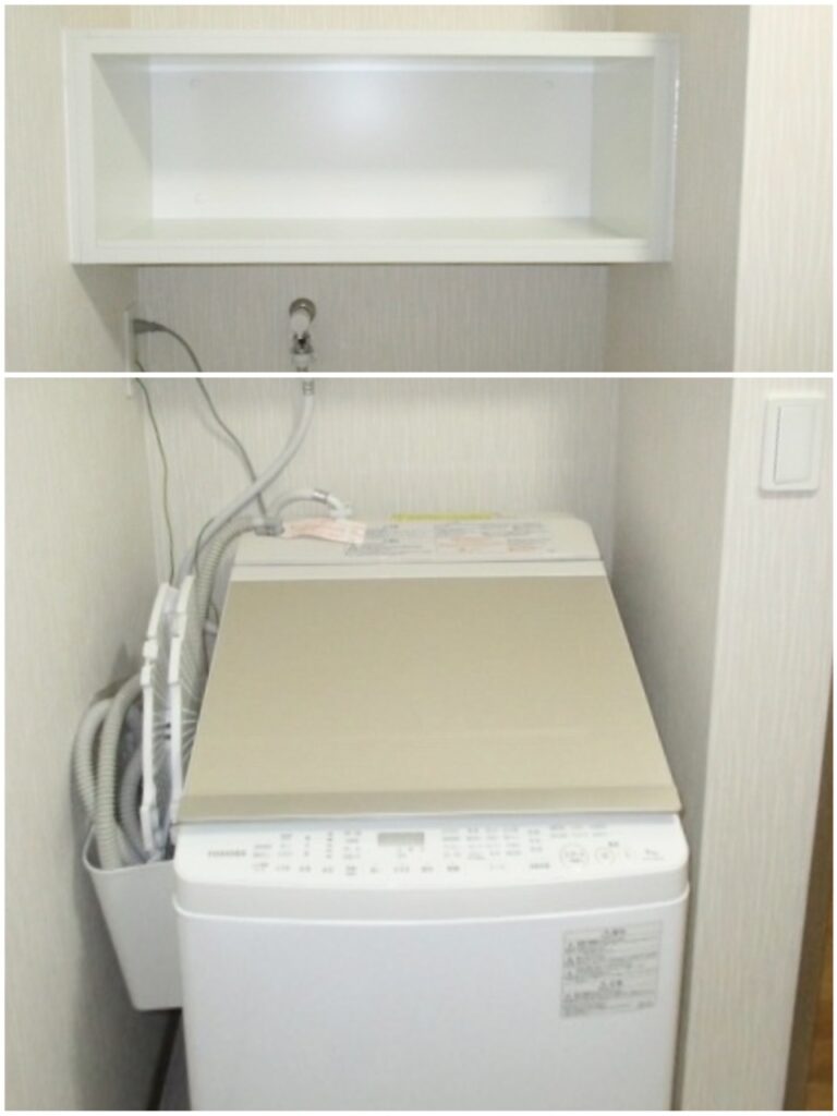 洗濯機上部の収納棚を撤去→新しく棚を造作して設置しました。洗濯用コンセントと給水栓を移設しました。