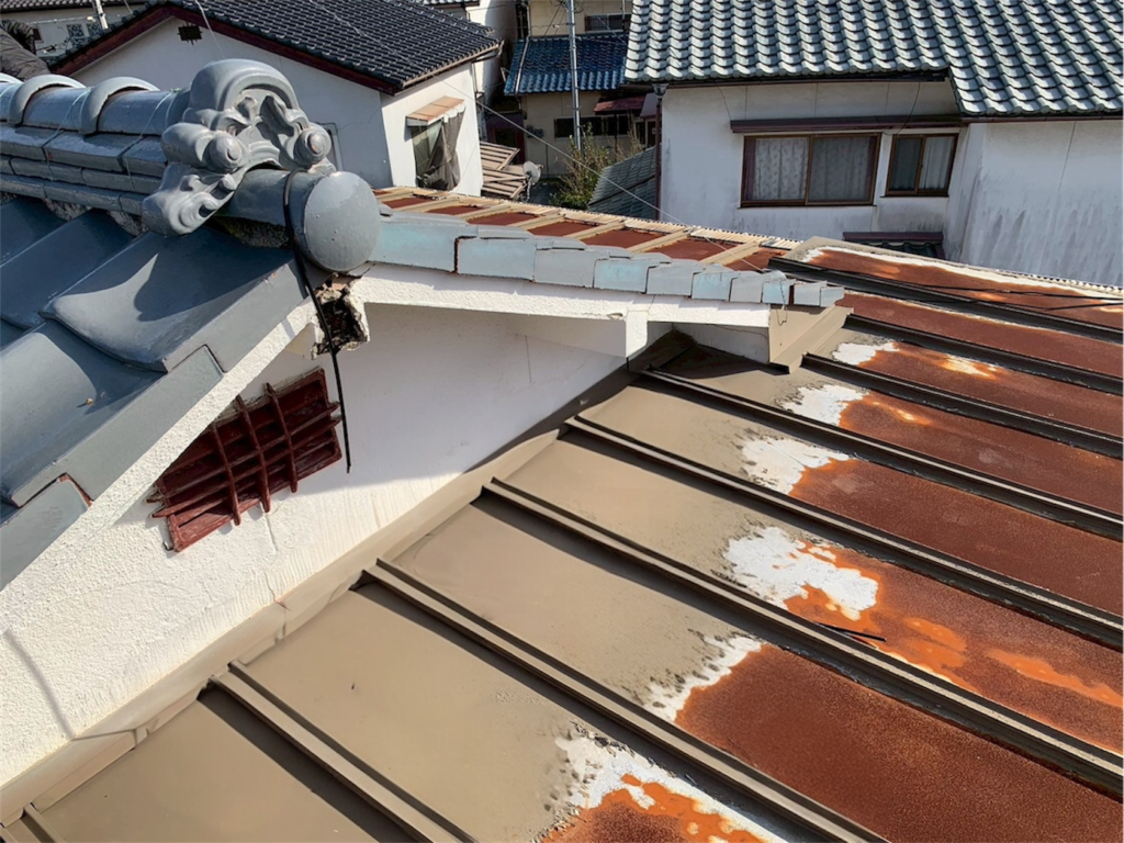 サビや塗装の剥がれが目立ち、雨漏りの原因となっていた既存の屋根。