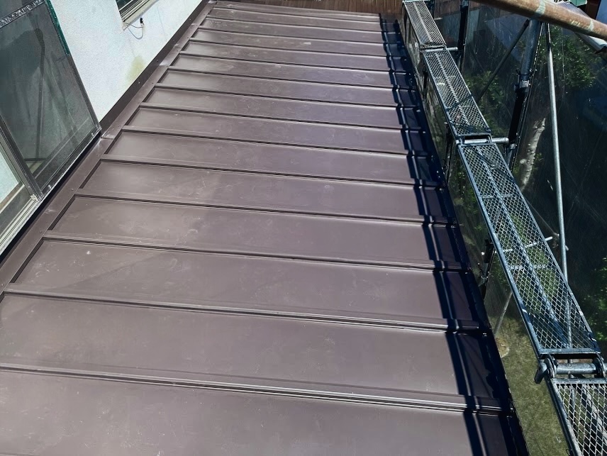 そこで今回は鋼板屋根の葺き替え工事(カバー工法)をご提案! 軒先や唐草の施工から、ルーフィングの設置、鋼板屋根の縦葺き、さらに下屋バルコニーの解体・復元やポリカ屋根の交換、BSアンテナの取り外し・戻しまでを含むフル工程で施工させていただきました。