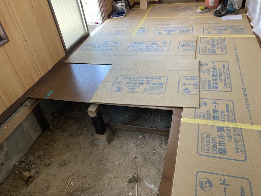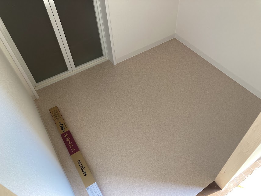 浴室のとなりに新しく脱衣室をつくりました。床は下地をしっかり組み直し、仕上げにはお手入れしやすいクッションフロア(CF)を採用。