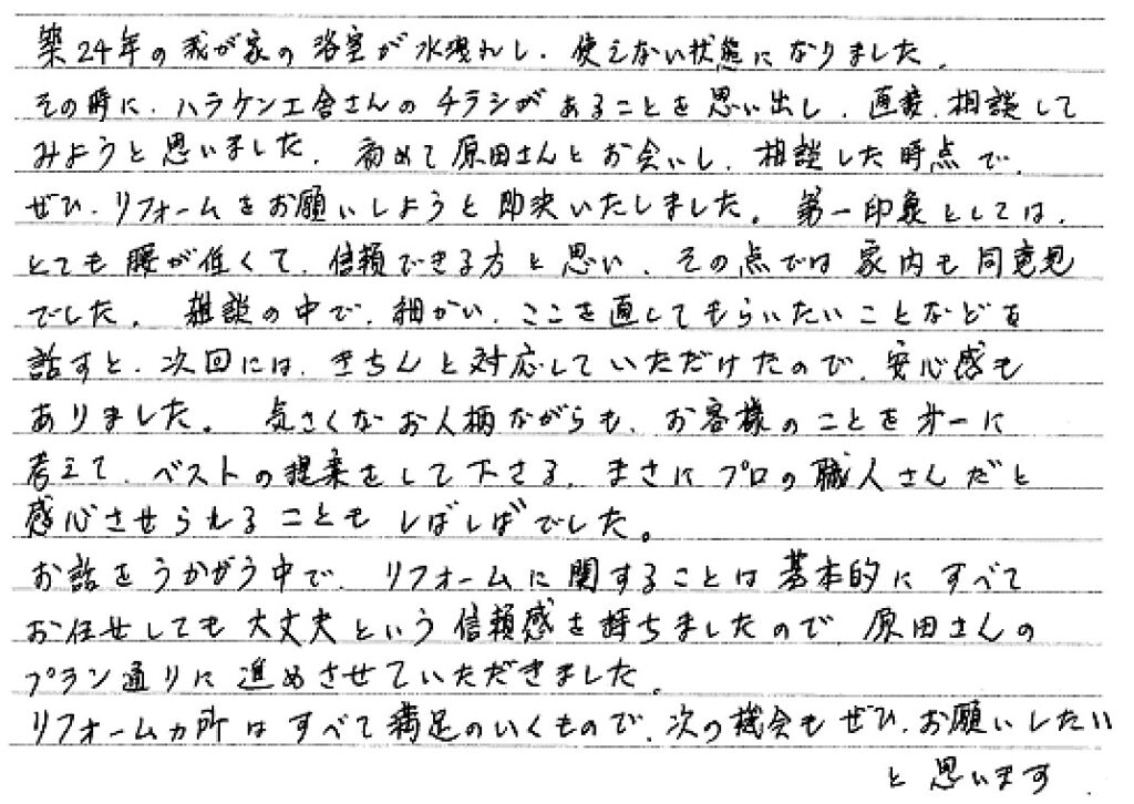 築24年の我が家の浴室が水漏れし、使えない状態になりました。その時に、ハラケン工舎さんのチラシがあることを思い出し、直接相談して見ようと思いました。 初めて原田さんとお会いし相談した時点で、ぜひリフォームをお願いしようと即決いたしました。