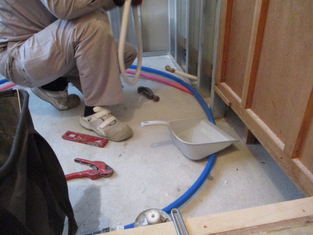 • 設備工事  給排水配管の接続(給水管(青)、給湯管(ピンク)、追炊き用ホース(白))→電気配線の工事をしました。