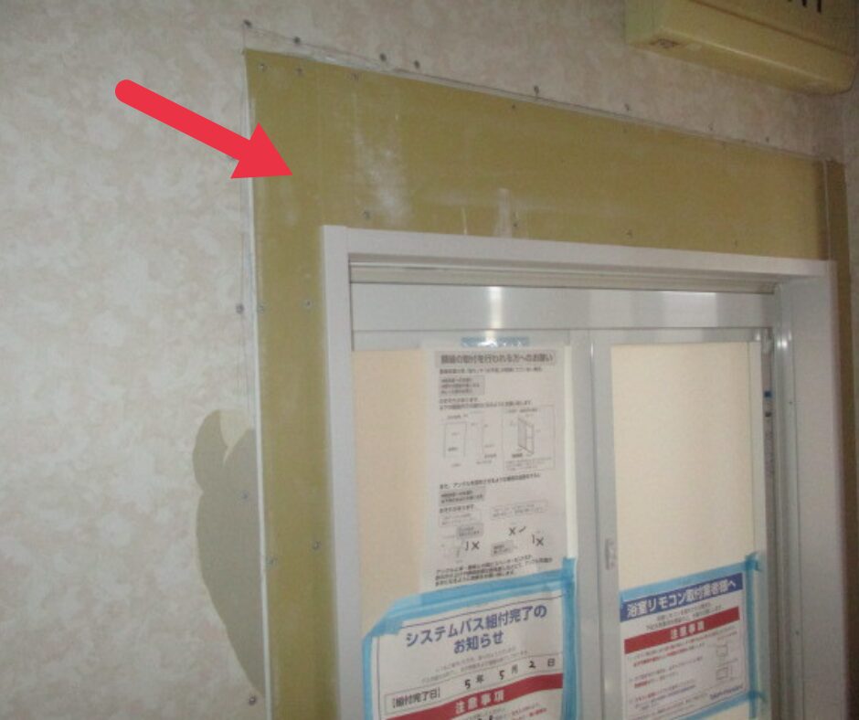 • 脱衣室側壁一部補修  浴槽など搬入する際、既存出入口側を撤去した為、新しい折れ戸に合わせて、下地材を取付け、壁を造ります。