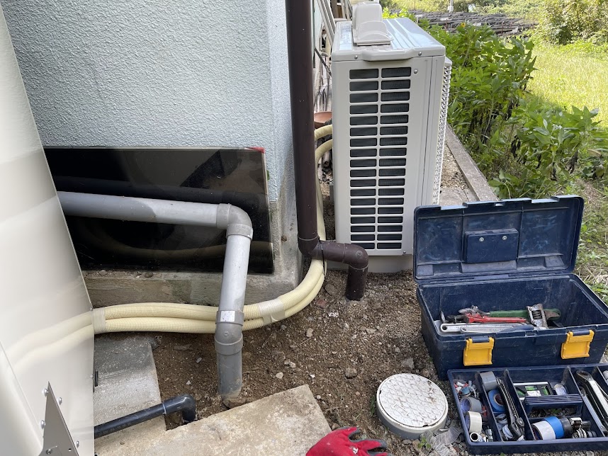 配管移設から電気工事、リモコン新設までワンストップで対応し、設置スペースに合わせて、すっきり・安全に収まるよう施工しています。