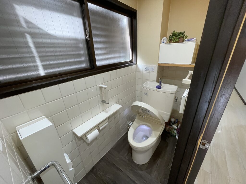 壁のタイルや棚下の空間に、少し古さを感じるトイレ空間。
