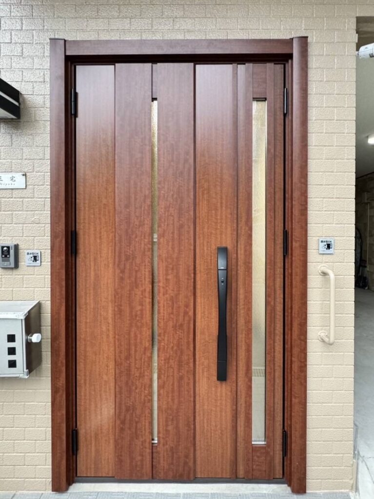 LIXIL リシェント 断熱仕様 K4 M12型 へ交換。デザインは上品なポートマホガニーで、断熱性も大幅アップ✨ お家の〝顔〟が新しくなり、見た目も機能も大満足です。