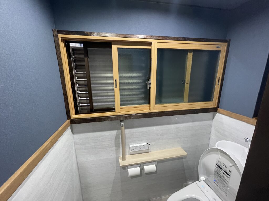 • 上部にはブルーのクロスを採用し、落ち着きのあるトイレ空間になりました。 内窓も設置しています。