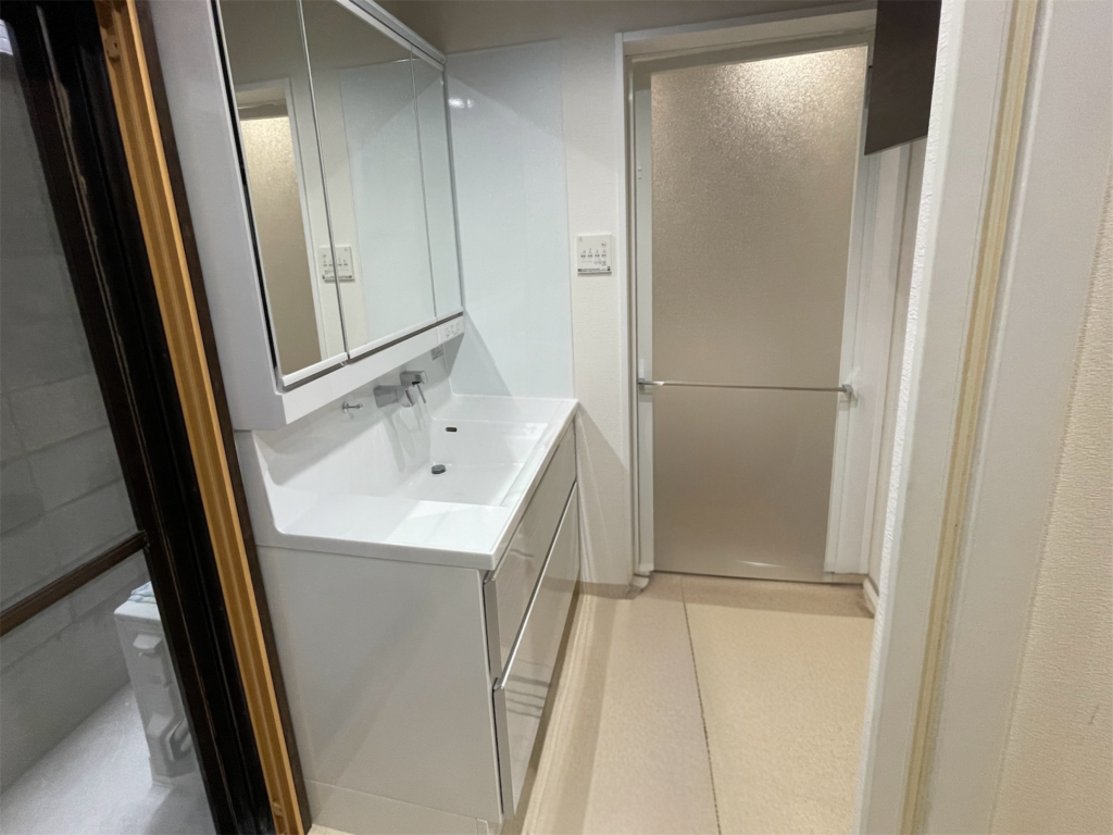 タカラの「ファミーユ」で明るくすっきり!収納も増えて、朝の身支度がスムーズになりました。 床はクッションフロア仕上げでお手入れも簡単です。