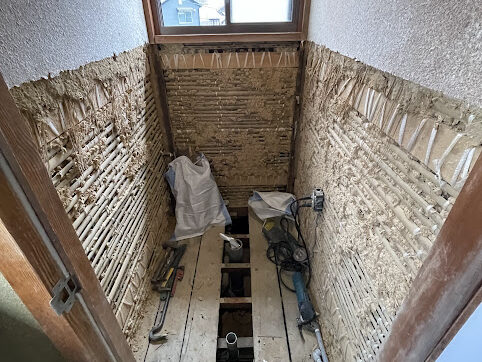 解体・撤去 便器・手洗い器をはじめ、床・腰壁タイル・天井を撤去処分。新しい便器に合わせ、排水管の位置を調整しました。
