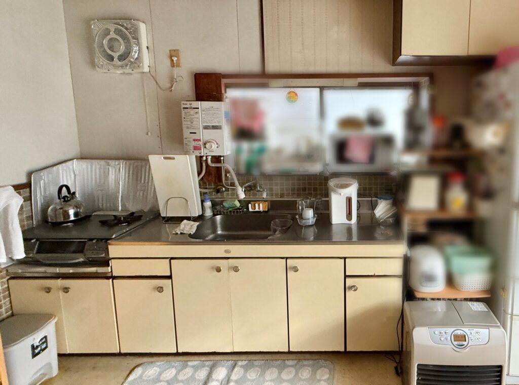 長年使われてきたキッチン。設備の古さや使い勝手にお悩みでした。床の沈みもあり、日々の使用に不安を感じられていました。 -