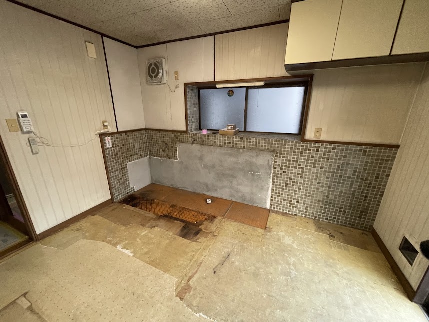 既存キッチン解体・撤去 長年使用されたキッチンを撤去し、床の状態も確認します。
