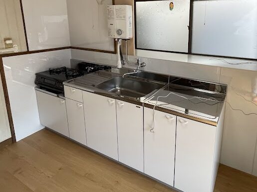 既存設備の復旧 ガス湯沸かし器は一旦取り外し、キッチン設置後元に戻して、再接続しました。 排水管、換気扇は既存のままです。水栓は新しいものに取り替えました。