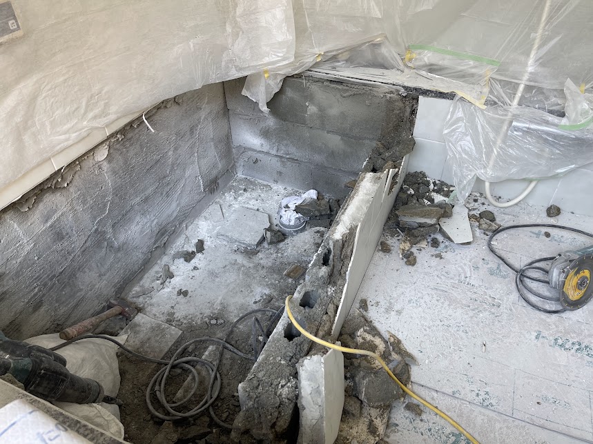 既存浴槽の撤去 既存の浴槽を解体・撤去していきます。周囲のタイルなど傷つけないよう、慎重に作業を進めていきます。